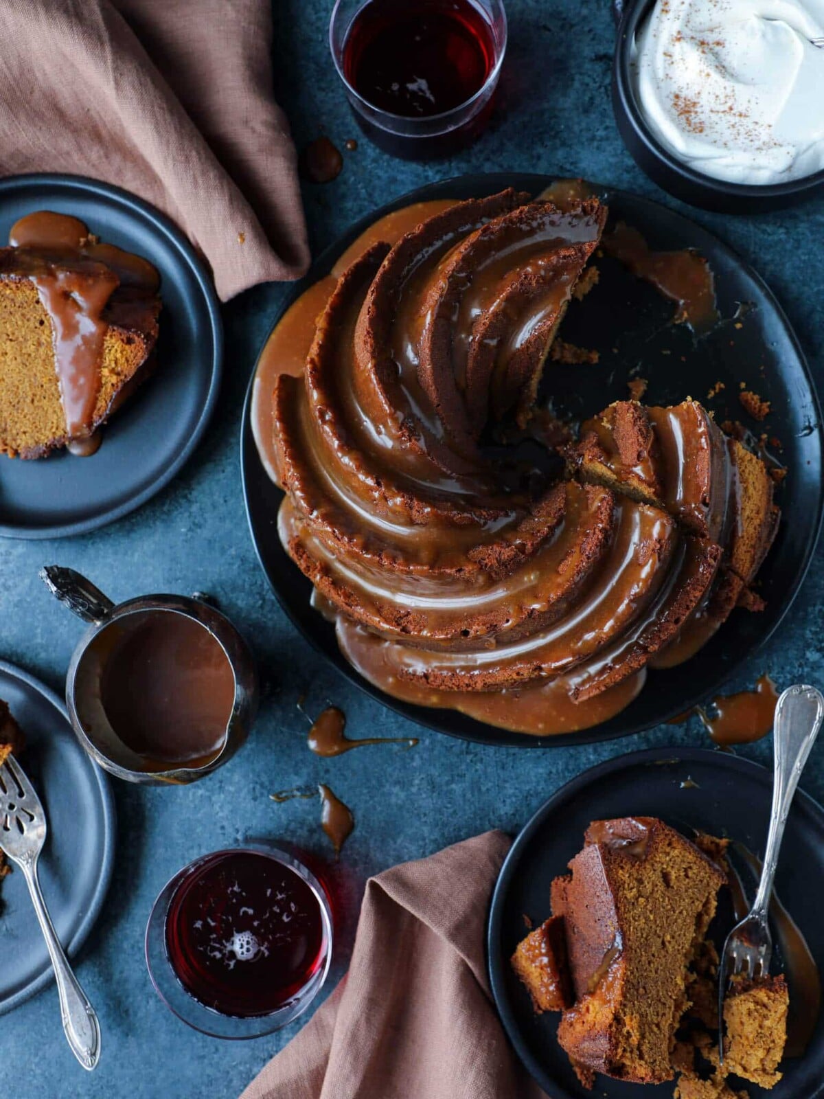 This molasses cake is dense, rich, and generously spiced. The spices and molasses pair beautifully with the salted caramel sauce. The cake isn’t overly sweet and has hints of rich old-fashioned molasses cake.