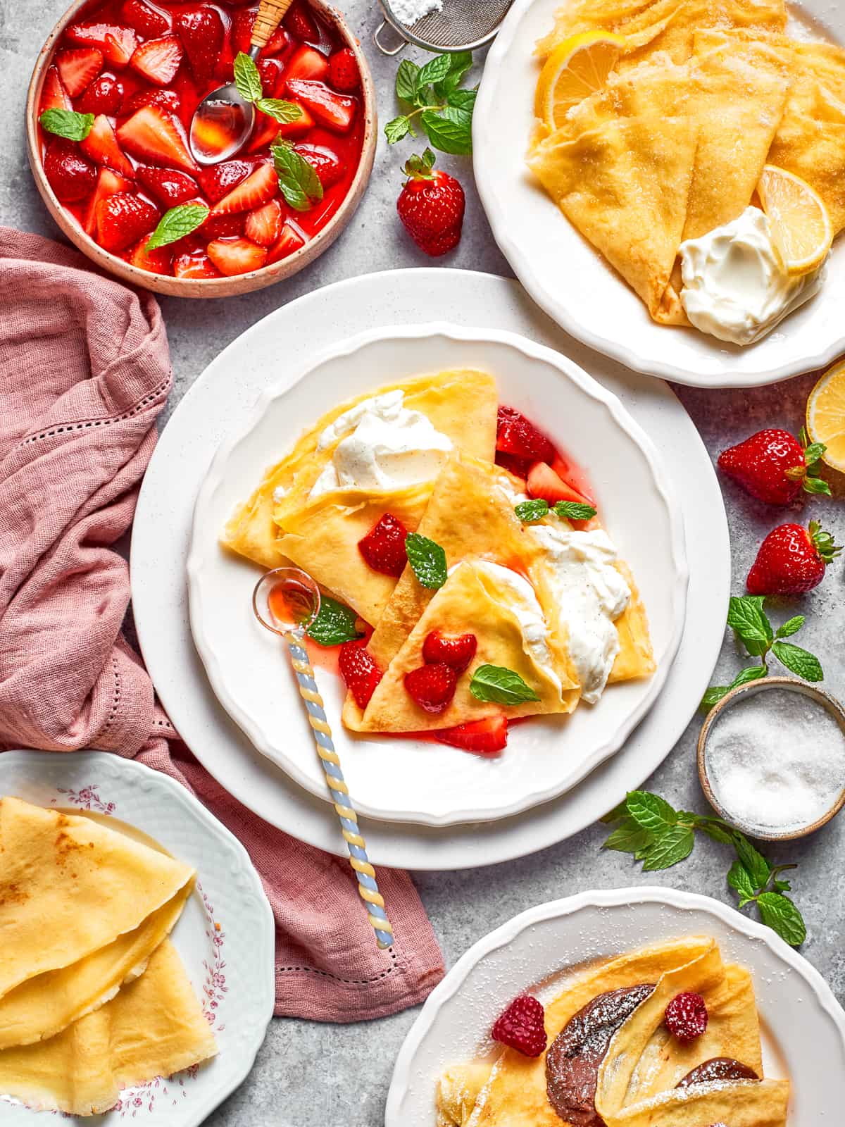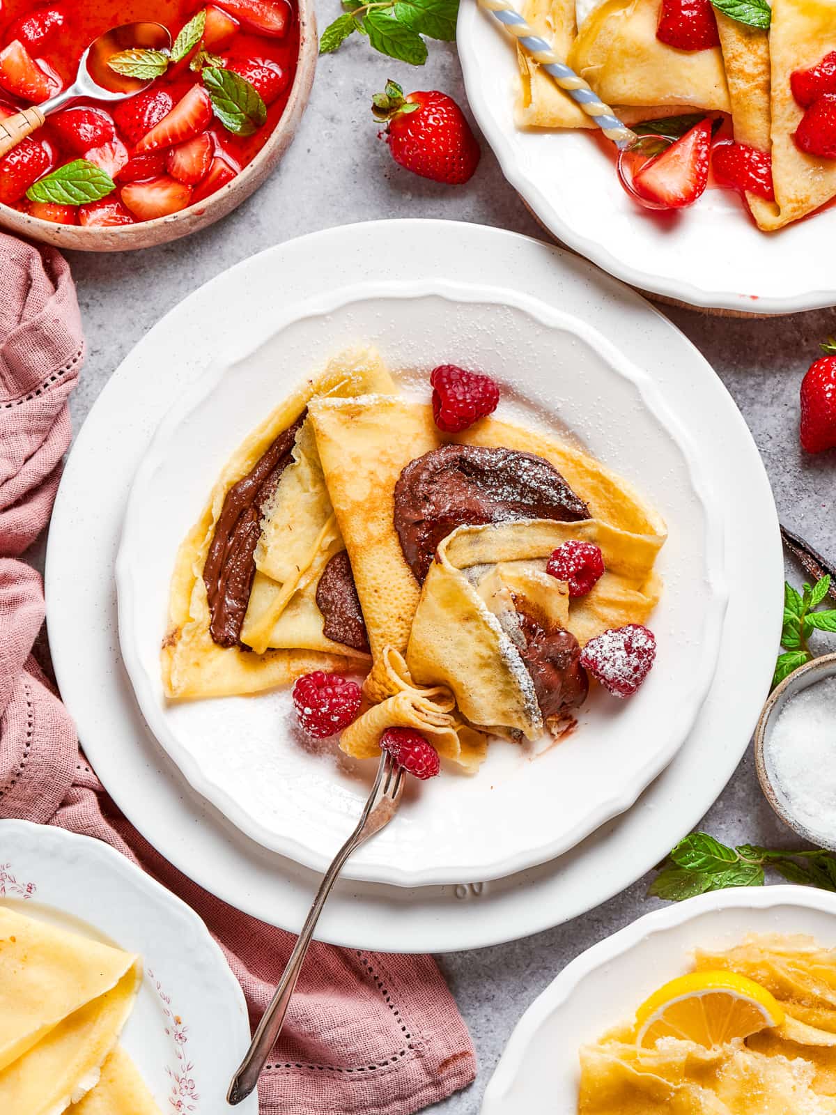 A thin, buttery sweet crêpe recipe along with all my professional tips for making paper-thin crêpes with crispy edges. Use this 6-ingredient crêpes recipe for dessert crepes, breakfast crepes, or mille crepe cake!