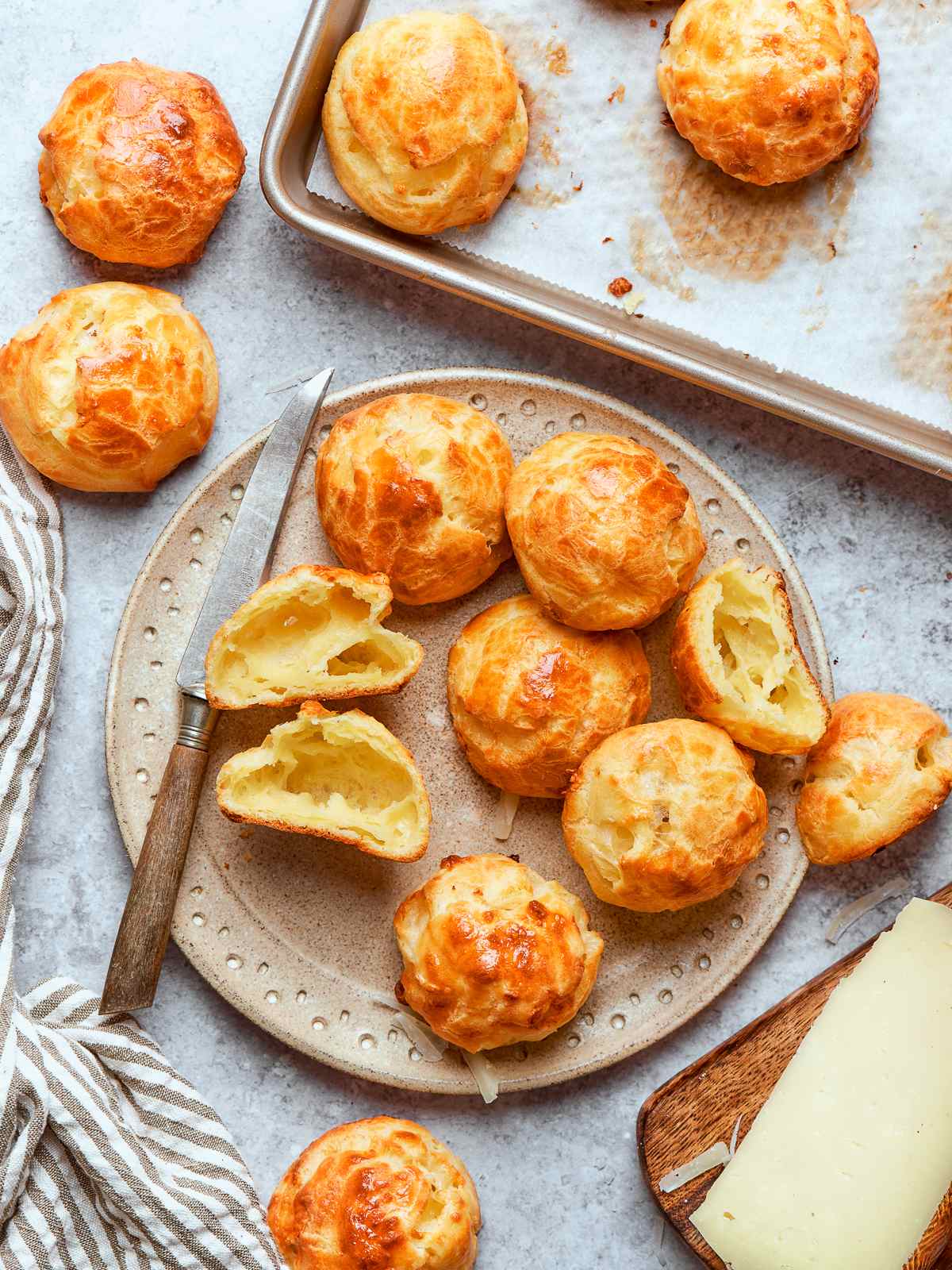 Properly baked gougères will be puffed, evenly golden brown, and feel light when you lift one off the tray. If they look pale but feel firm, give them another 2 minutes rather than pulling them early, as underbaked choux will collapse as it cools.
