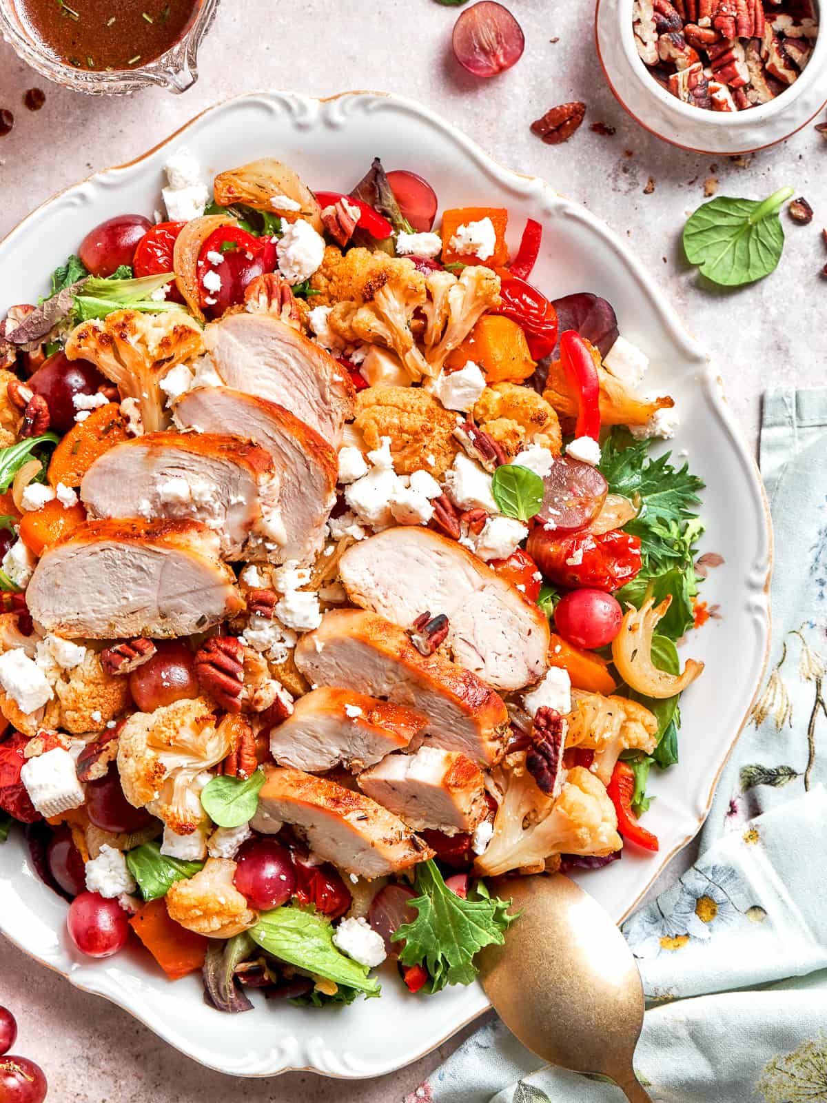 Step 5: Assemble. Toss greens with roasted vegetables, grapes, pecans, feta, and vinaigrette. Top with sliced grilled chicken if using (photos 6 & 7).